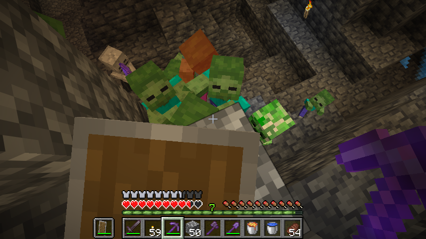 次に 多数の MOB から逃げる状況判断と移動能力 です。100 マスという狭い世界なので、MOB が密集しやすいです。物理的に戦闘では勝てないので逃げるのが基本です。以下くらいは当たり前に遭遇します: